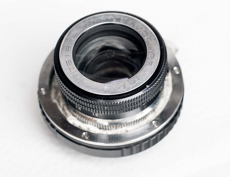 The lens shown in the following image is a Helios-103 rangefinder variant, but the mounting principle is universal: Find a sturdy adapter ring and fill it with putty. The lens will never sit perfectly perpendicular to the sensor, introducing a mild tilt effect, but it’s good enough for playing around.