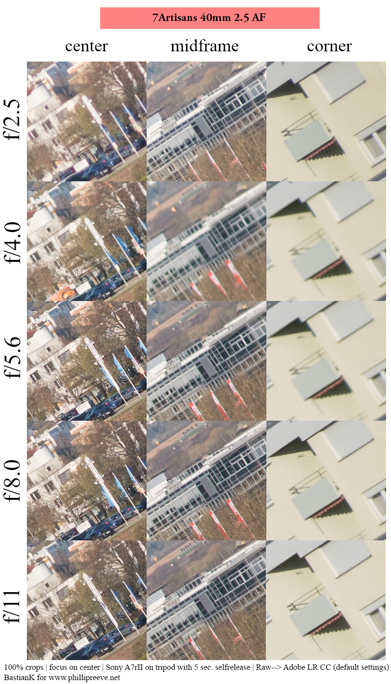 Similar to many other recent E-mount lenses also this 7Artisans 40mm 2.5 AF features a built-in lens correction profile for lateral CA that will be recognized in most raw converters, so you won’t be seeing any in your pictures.