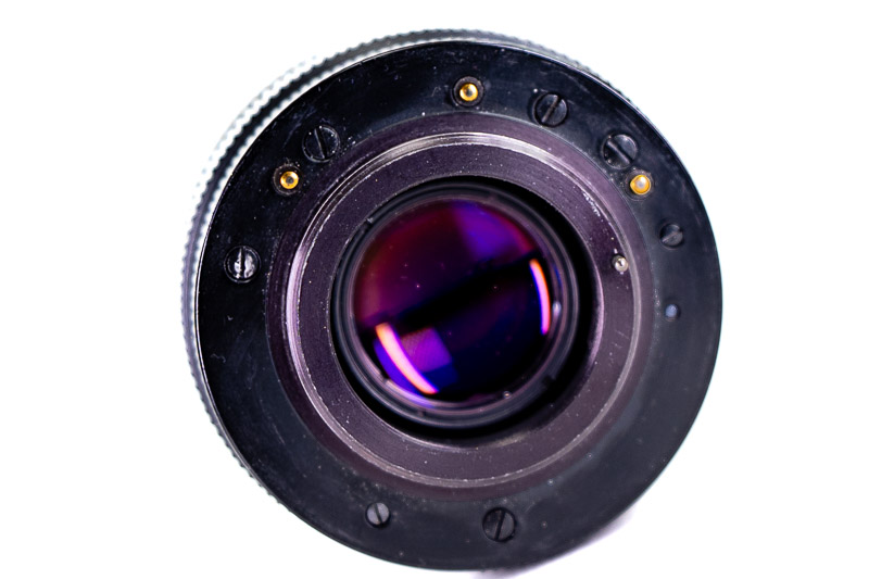 On the rear of the lens are a metal pin and three spring-loaded, gold-colored contacts. The pin is the standard mechanism for aperture control and is used in two situations. When the lens is set to the A position, the pin closes the diaphragm to the selected aperture at the moment of exposure, allowing for wide-open metering. It is also used for depth-of-field preview: when the camera’s depth-of-field lever is pressed, the pin closes the diaphragm to the working aperture and holds it there for as long as the lever is depressed, allowing you to judge depth of field in the viewfinder.
