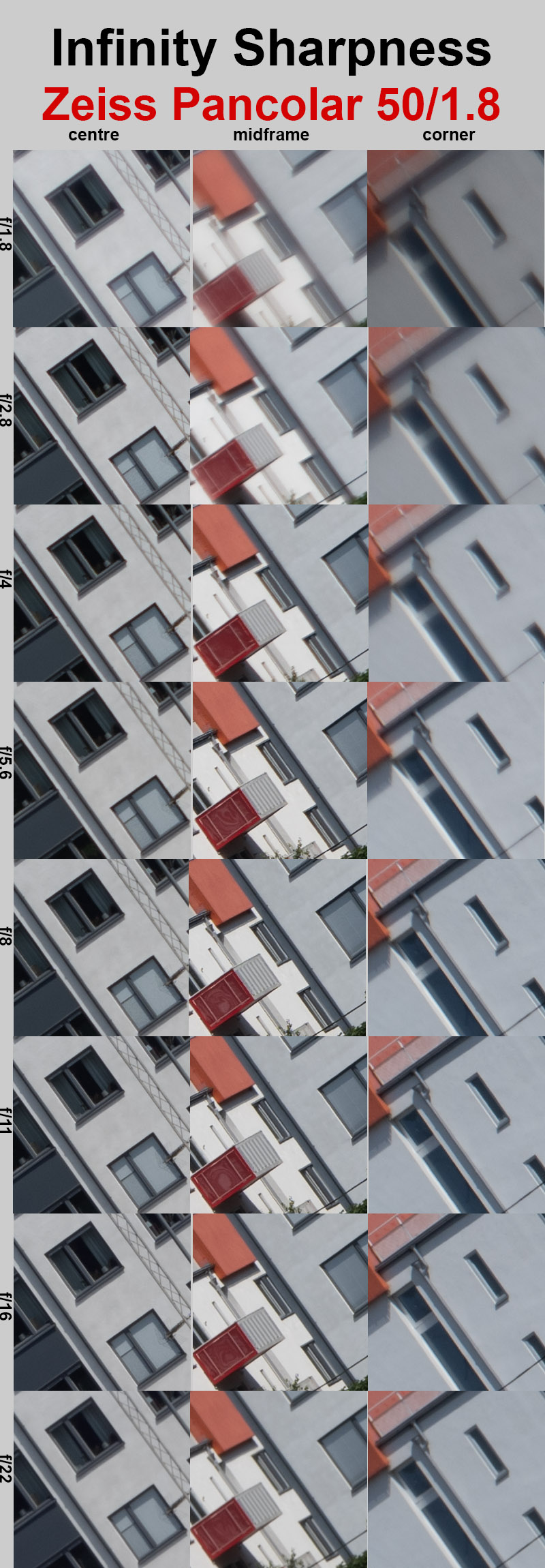 At f/8, the corners finally become good. The mid-frame improves slightly, while the centre remains unchanged, still very good.