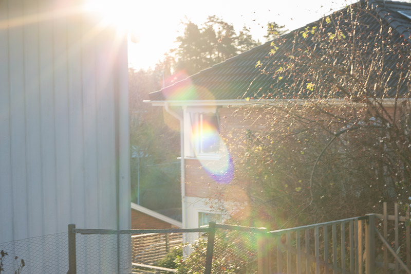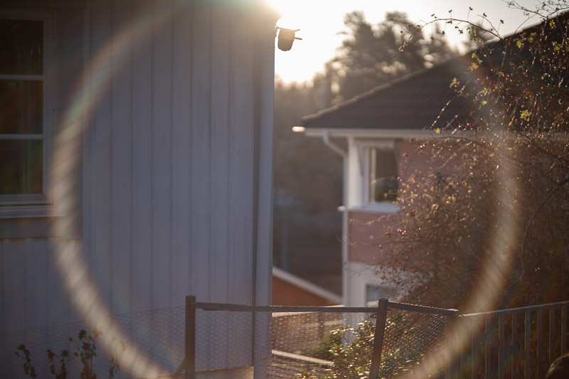 Unfortunately, the lens shows weak flare resistance and produces flare artifacts at all apertures. At wider apertures, however, the character of the flare changes; the distinctive flare patterns, including ring flare, could be used creatively in some portrait work.
