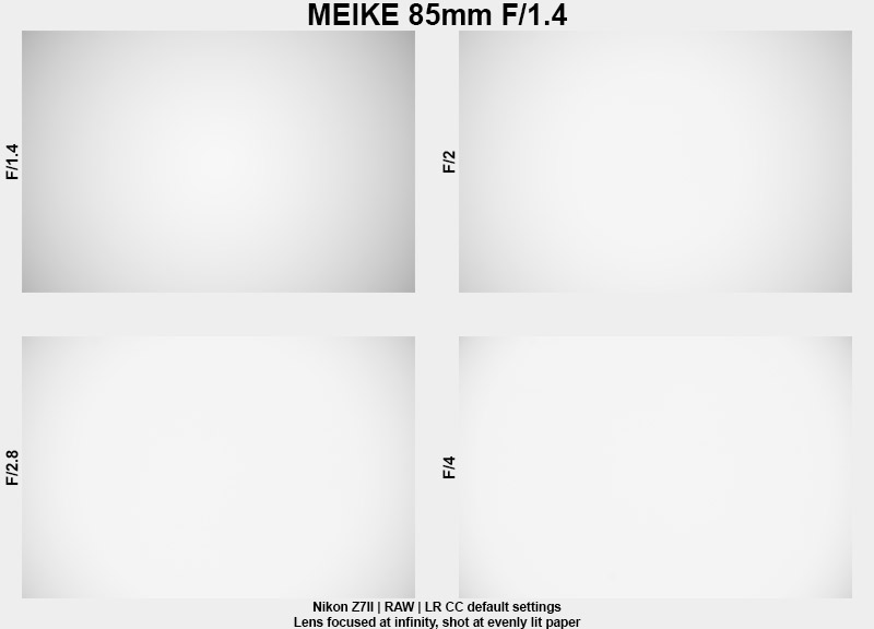 Vignetting is moderate at f/1.4. At f/2, it is low, decreasing further to very low at f/2.8. At smaller apertures, vignetting is negligible. Telephoto lenses typically exhibit relatively low vignetting, and this lens follows that pattern.