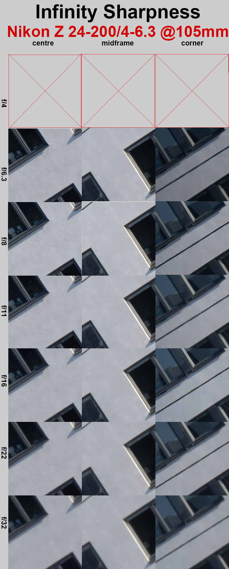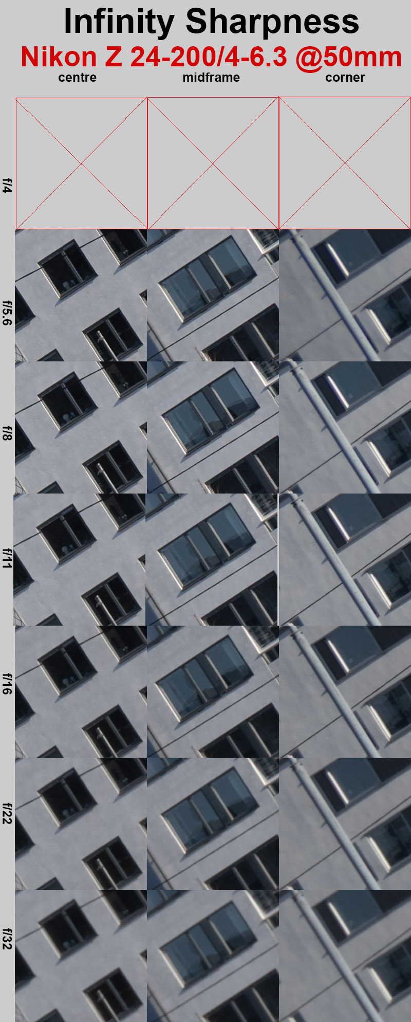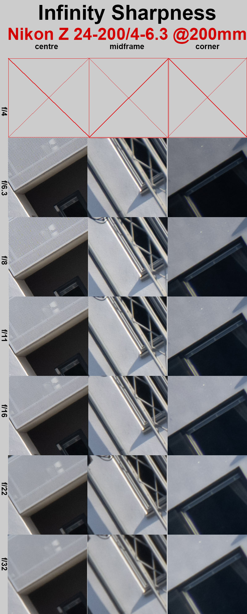 Excellent sharpness at all focal lengths up to 120mm. At 200mm we can see the image softens at its maximum aperture, becomes good at f/8, and very good at f/11.