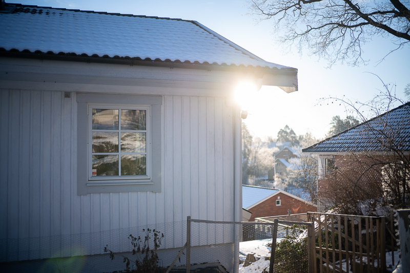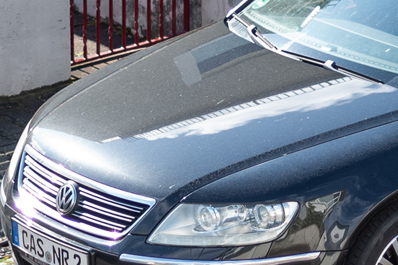 There is a small amount of lateral chromatic aberration, visible as blue fringing in extreme backlit situations. Under normal shooting conditions, this is not noticeable, and it is easily corrected with a single click in post-processing. Here you can see a 100% crop from an image corner in a high-contrast backlit scene, shown with and without correction. The Summilux shows a similar amount of LaCA.