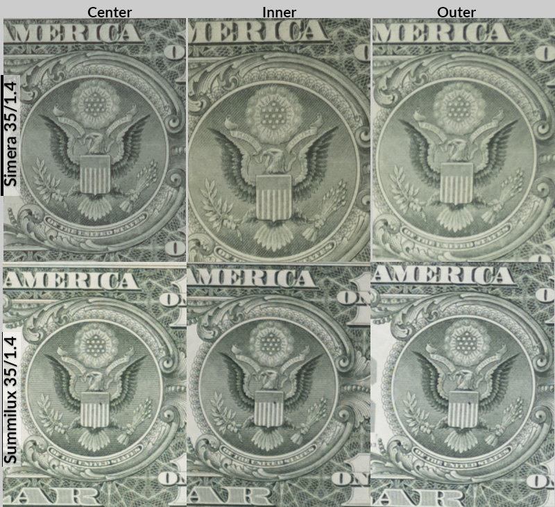 In direct comparisons, the Simera exhibits more spherical aberration wide open, which results in slightly lower contrast and resolution than the Summilux. Both lenses improve noticeably at f/2, though the Summilux still retains a small edge. By f/2.8, the Simera appears marginally sharper. From there to f/4, performance remains essentially unchanged.