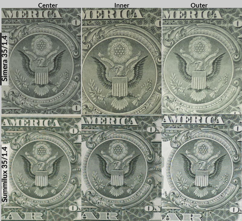 Compared to the Summilux, the center is at least as good, but the Summilux seems to be free from fringing, and its corner is about 2 stops better.