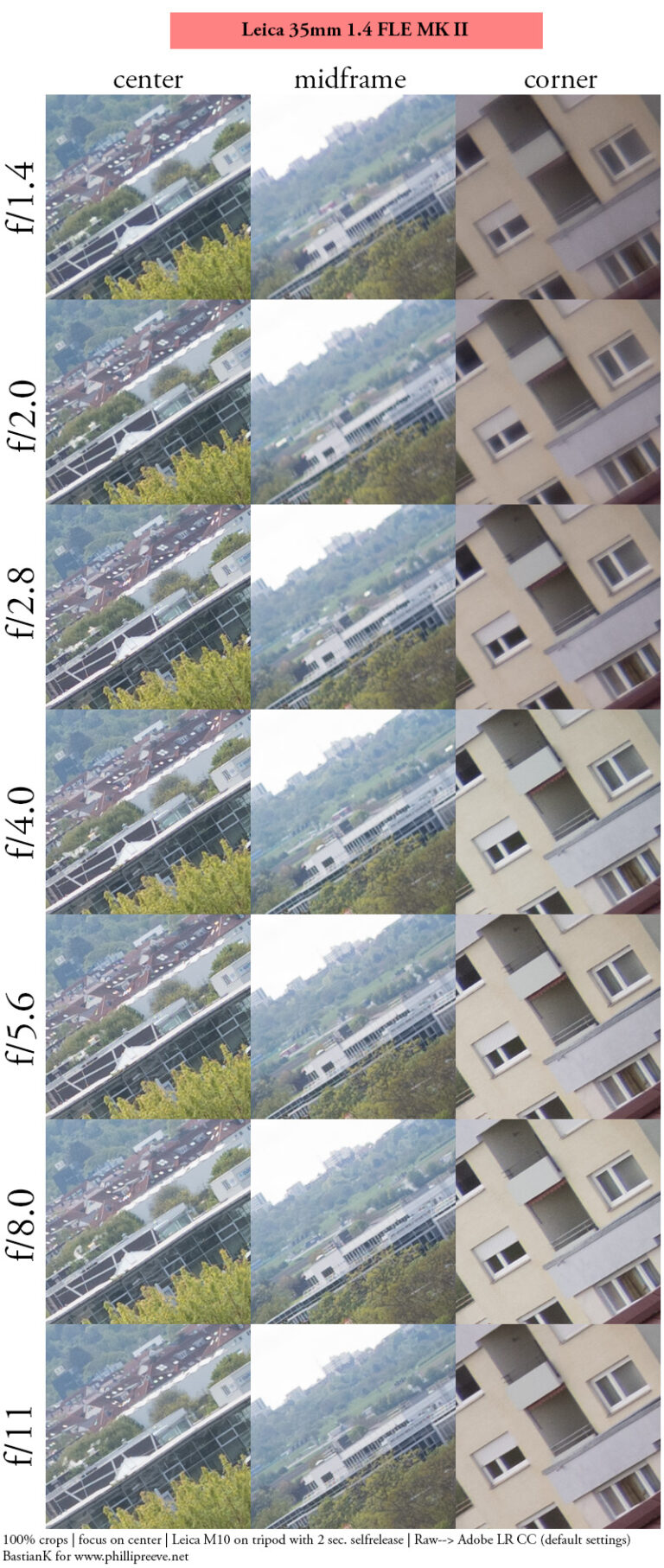 Here, with the Leica Summilux on a Leica M10, we see very typical performance for a 35mm f/1.4 lens, with rather strong fringing at maximum aperture that doesn’t completely clear up even by f/2.8. Also note that the Thypoch Simera tests were done on a 46 MP camera, while the Leica tests were on a 24 MP body, which, if anything, should favor the Leica here.