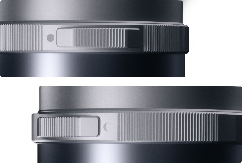 The aperture ring can be declicked via a switch on the ring, marked with a sun for clicked operation and a crescent moon for the declicked position.
