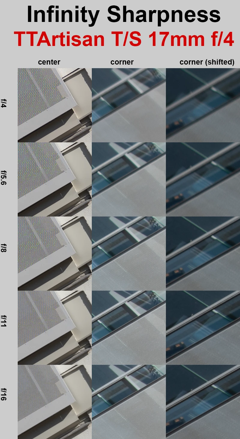 Sharpness is excellent in the center right from wide open at f/4, but the corners require some stopping down. Closing the aperture to f/5.6 brings an improvement, though not enough to fully satisfy. At f/8, the corners reach a very good level of sharpness. For the best overall performance, f/11 delivers excellent sharpness both in the normal position and in the corners when shifted.